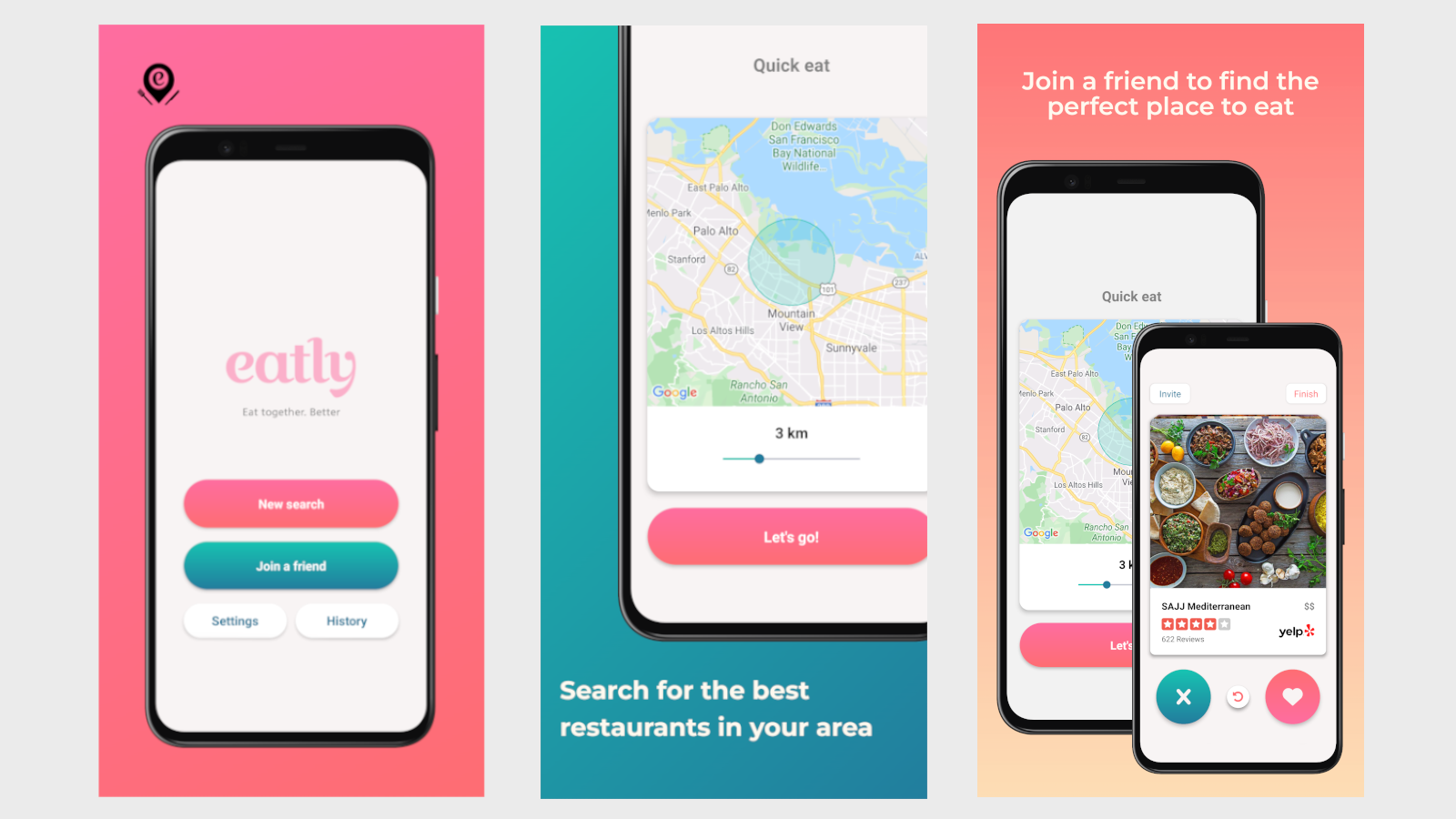 A decommissioned Android and iOS app that matched restaurant choices between friends by suggesting locations and filtering mutual selections.